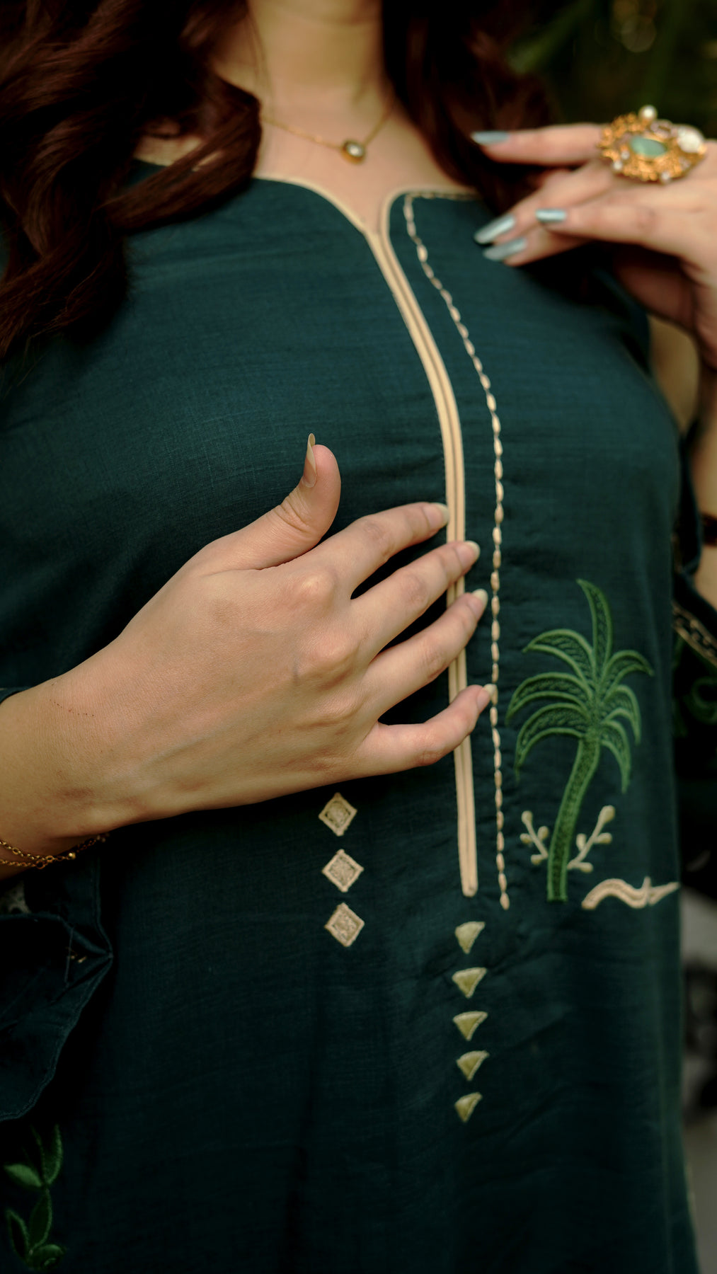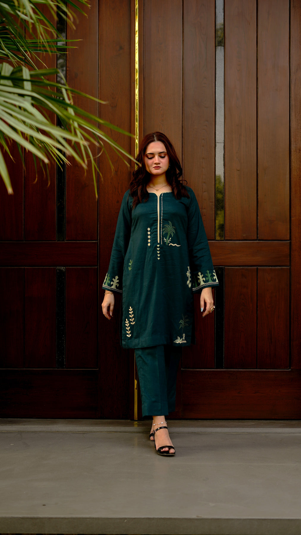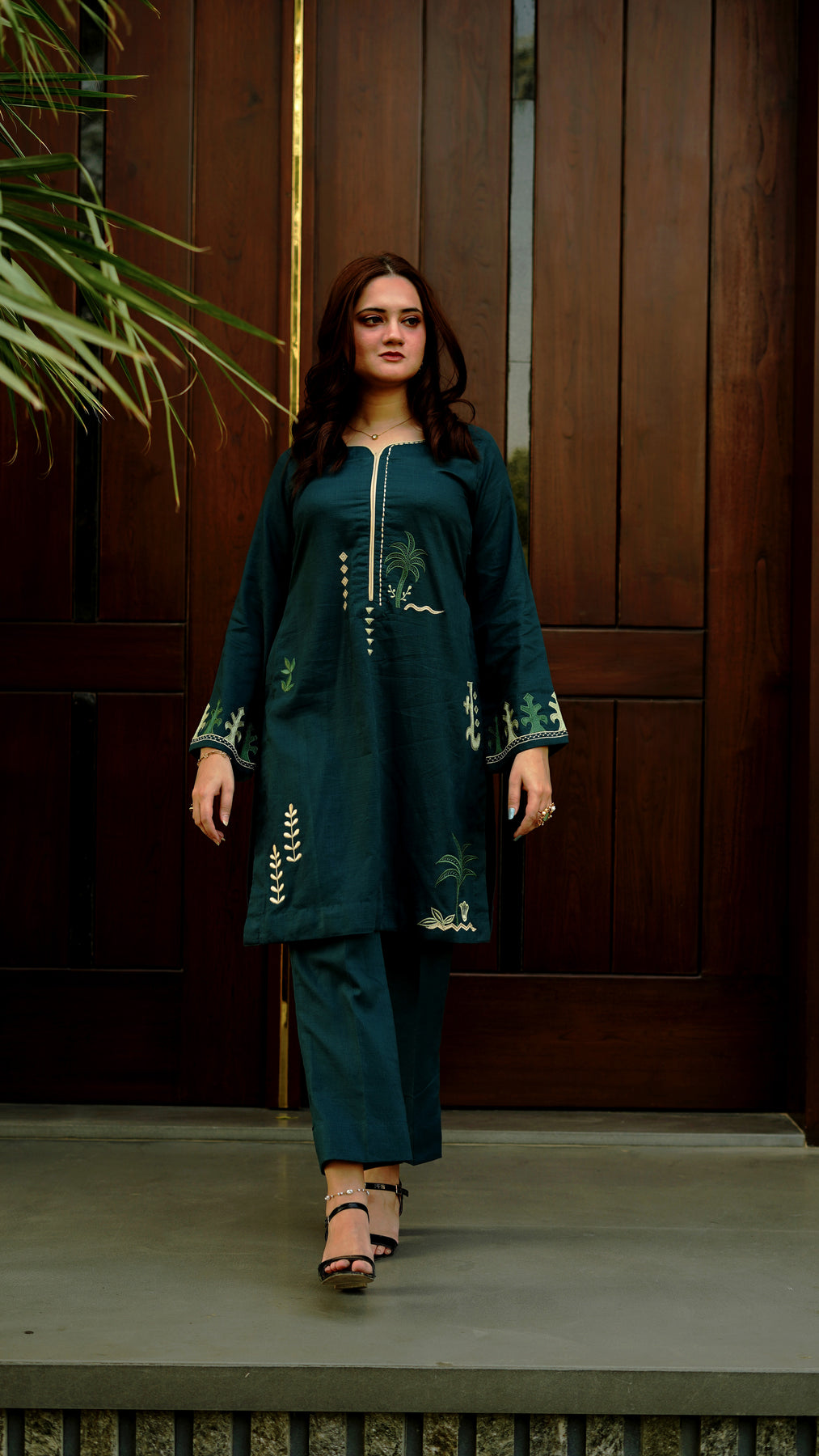 Rich green embroidered suit with refined tropical detailing for a timeless and polished appearance. The shirt features delicate embroidery scattered across the front and sleeves. Paired with a straight-cut trouser for a balanced silhouette, this ensemble blends comfort with timeless style.