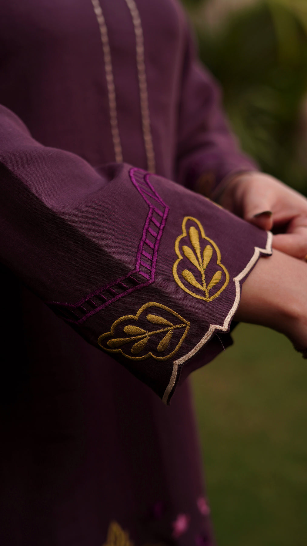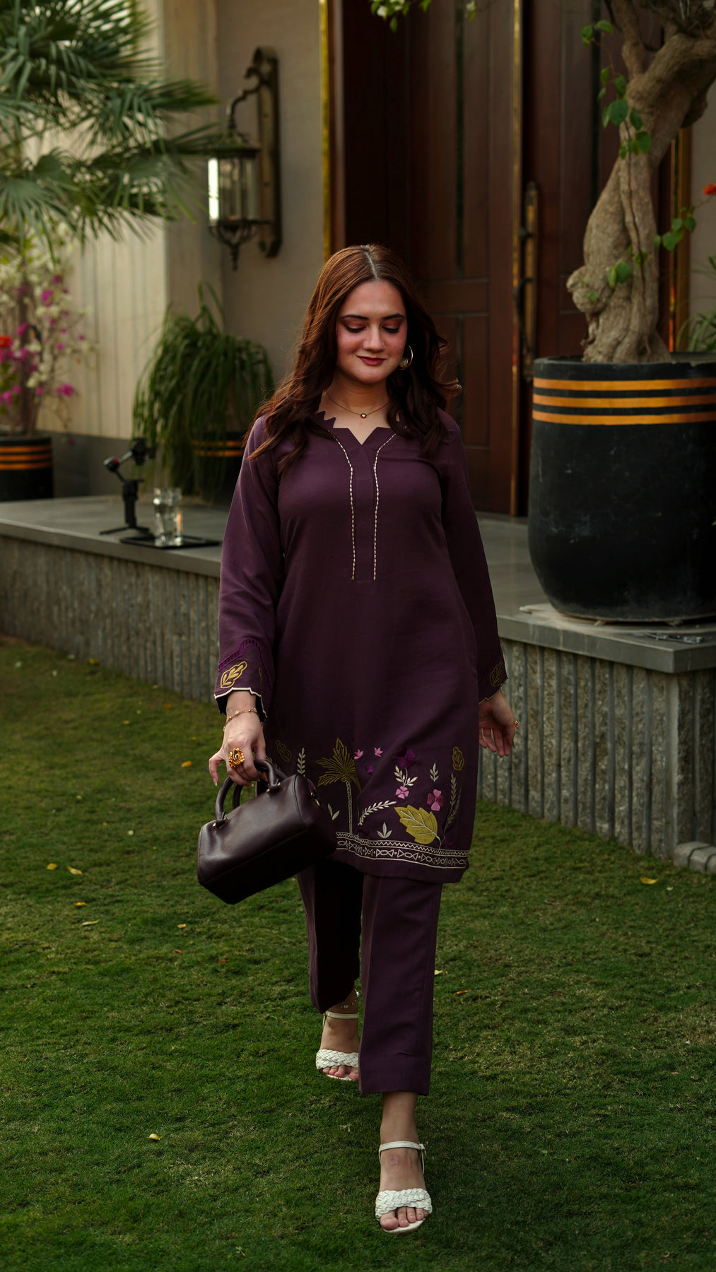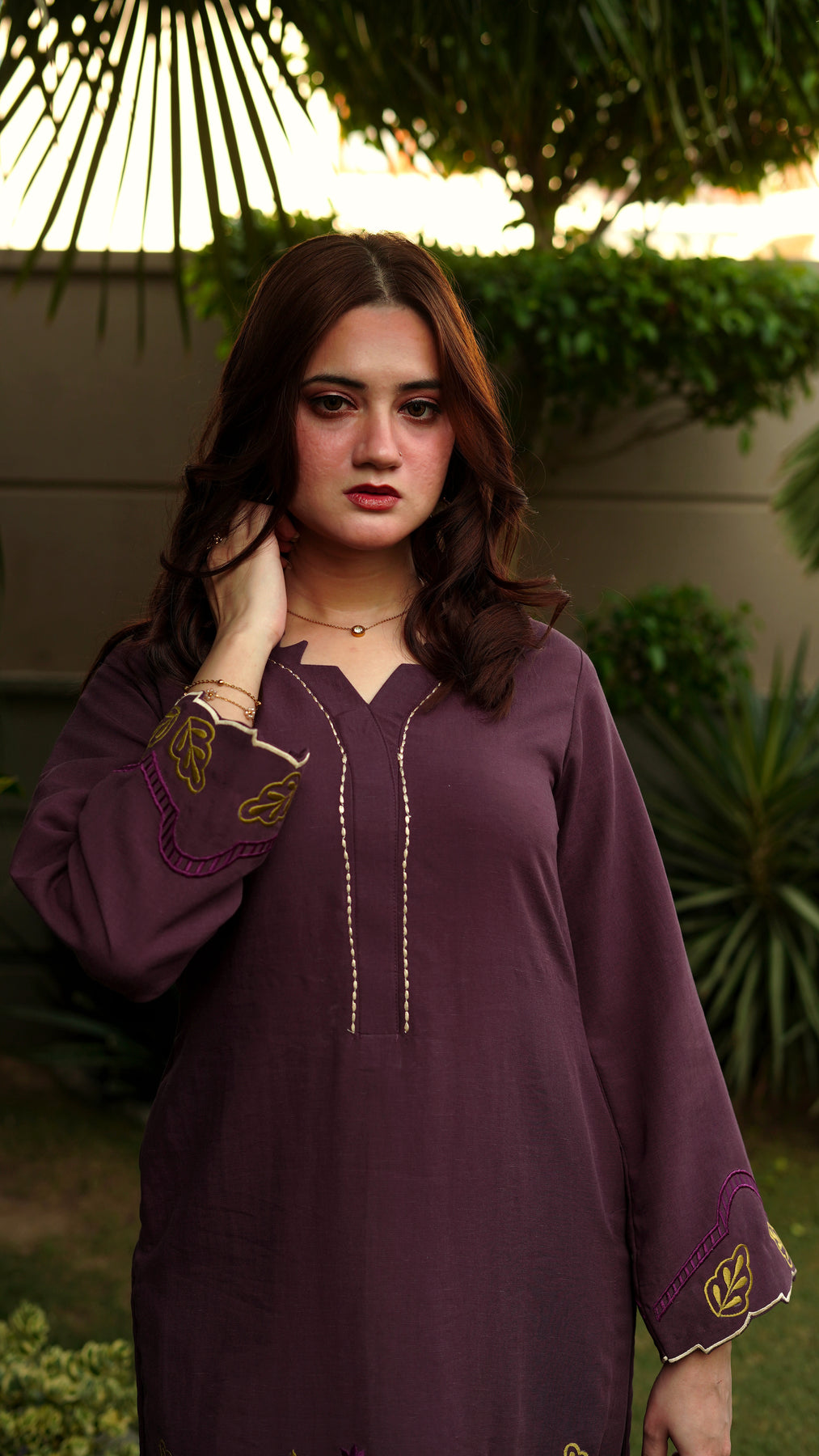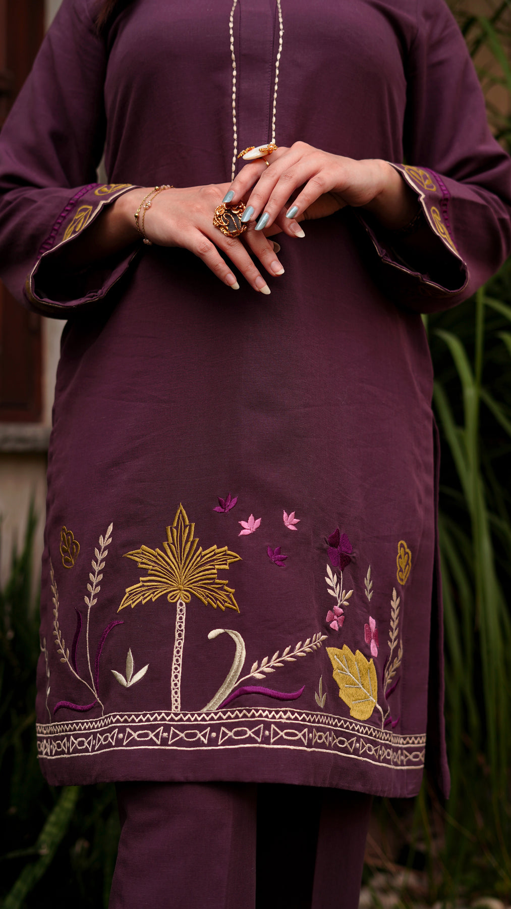 A refined deep purple suit featuring delicate tropical embroidery on the neckline, hem, and sleeves. Designed in a breathable fabric with a straight silhouette, this piece offers effortless elegance for daytime wear. Paired with a straight-cut trouser for a balanced silhouette, this ensemble blends comfort with timeless style.